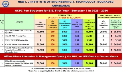Admission to the Engineering courses are done on the basis of GUJCET/JEE main, where 50% weightage is given to HSC qualifying examination and 50% to the entrance exam scores.